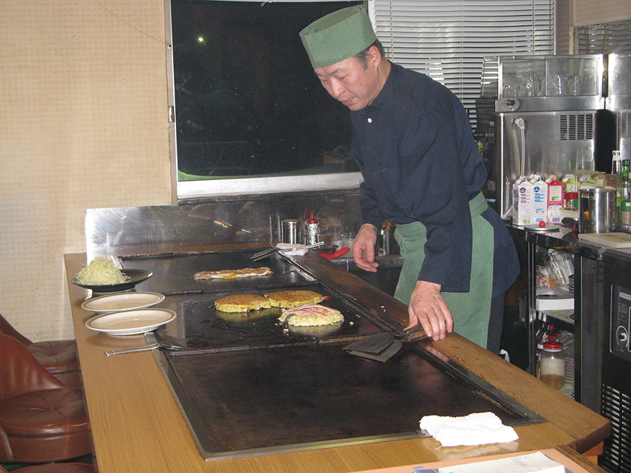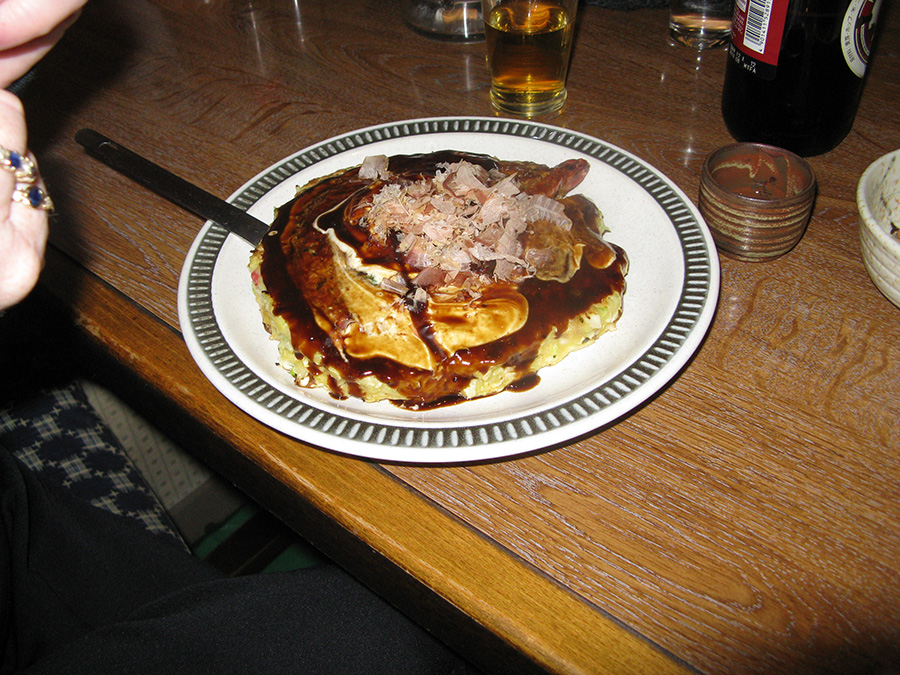 - Now, using the tools that you flipped and molded the Okonomiyaki with, cut into chunks and eat, washed down with copious amounts of saki.