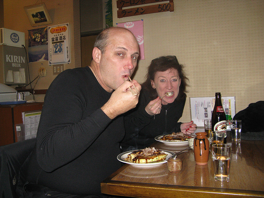 Kansai-style okonomiyaki on the other hand is mixed together before being cooked like a pancake. Then sauces are squirted across the top, like mayonnaise and a form of BBQ sauce. Yes, sounds good already doesn’t it? That is what we eat after a hard day of skiing.
